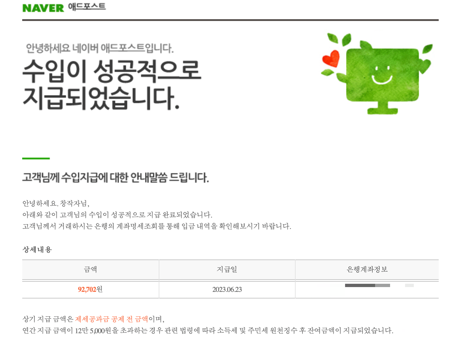 애드포스트로 수익이 생겨도 그게 내 통장에 진짜로 들어와야지 그때부터 진짜 수익이겠죠? 애드포스트 등록 시에 지급 받을 계좌 정보를 입력한 뒤에 수입 지급 금액을 설정해 줄 수 있습니다. 최소 금액은 50,000원이고 자동 지급을 설정해 놓으면 지급 전, 후로 메일이 옵니다. 하지만 주의 해야 할 점은 지급 안내에 적힌 금액은 제세공과금 공제 전 금액이라는 것입니다. 그래서 메일에는 92,702원이 지급된다고 적혀 있었지만 84,545원이 입금되었습니다. (내 8,000원...)